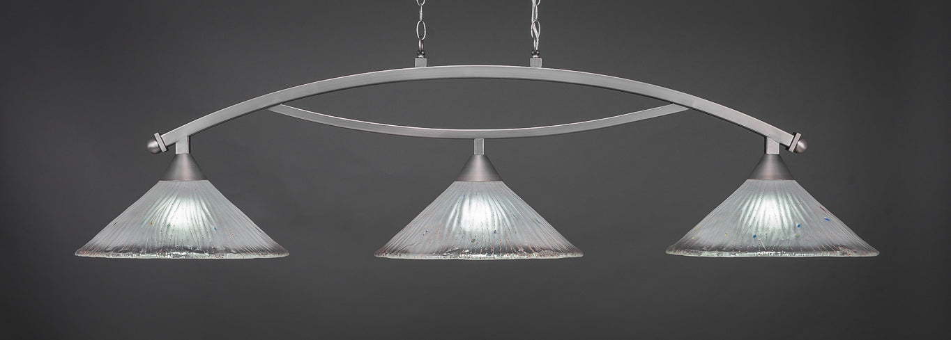 The 873-BN-711 light from Toltec is part of their Bow series and is an excellent non-traditional choice for contemporary billiard table or island lighting. It is rated at 120V for indoor use and is designed for hardwired installation. The 873-BN-711 requires 3 Incandescent bulbs. Includes manufacturer 1-year warranty. Some assembly required (instructions included).