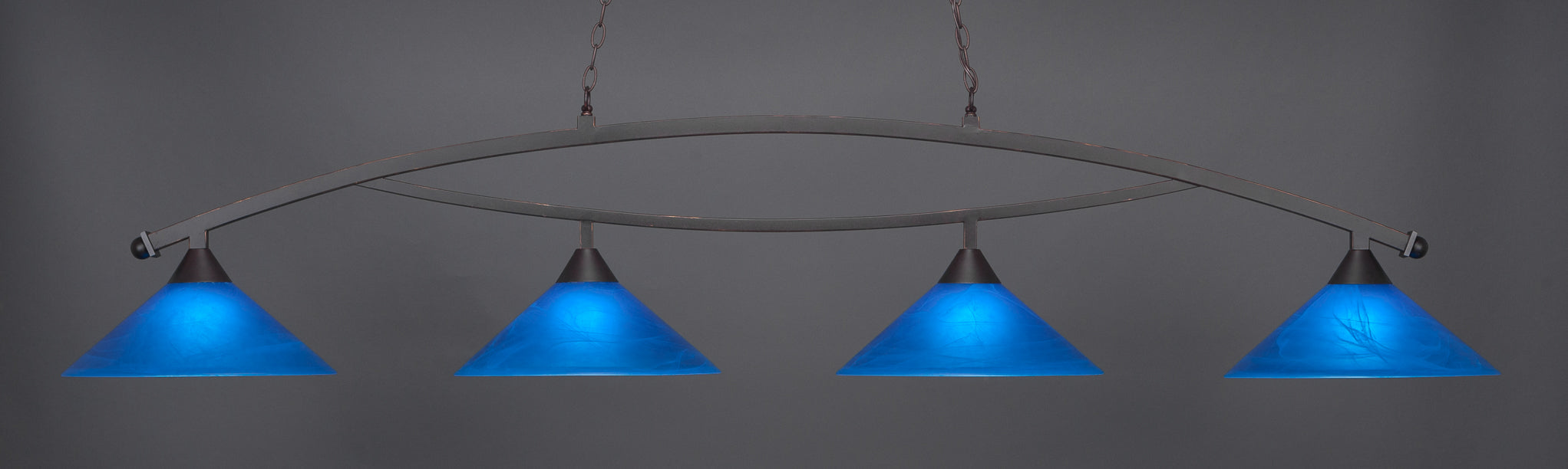 The 874-DG-415 light from Toltec is part of their Bow series and is an excellent non-traditional choice for contemporary billiard table or island lighting. It is rated at 120V for indoor use and is designed for hardwired installation. The 874-DG-415 requires 4 Incandescent bulbs. Includes manufacturer 1-year warranty. Some assembly required (instructions included).