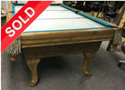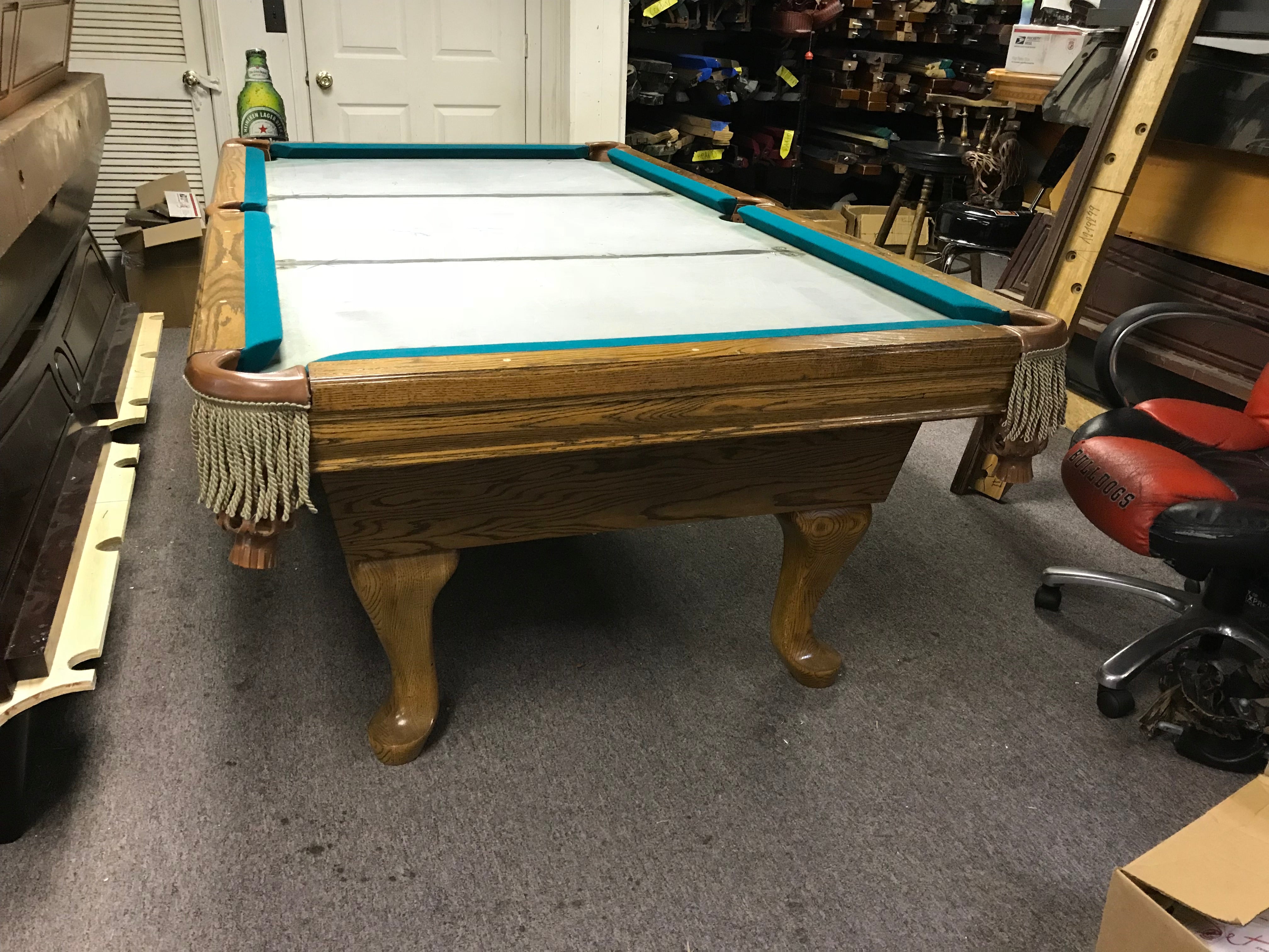 Like new, dark oak stain with leather honey fringe pockets. As always, our price includes your choice of felt colors from our ProLine Classic color palette, a play package with everything you need to start playing, and delivery and installation within a 30 mile radius of Loganville, GA. If you are not within our local service area, please call for any additional delivery fees.