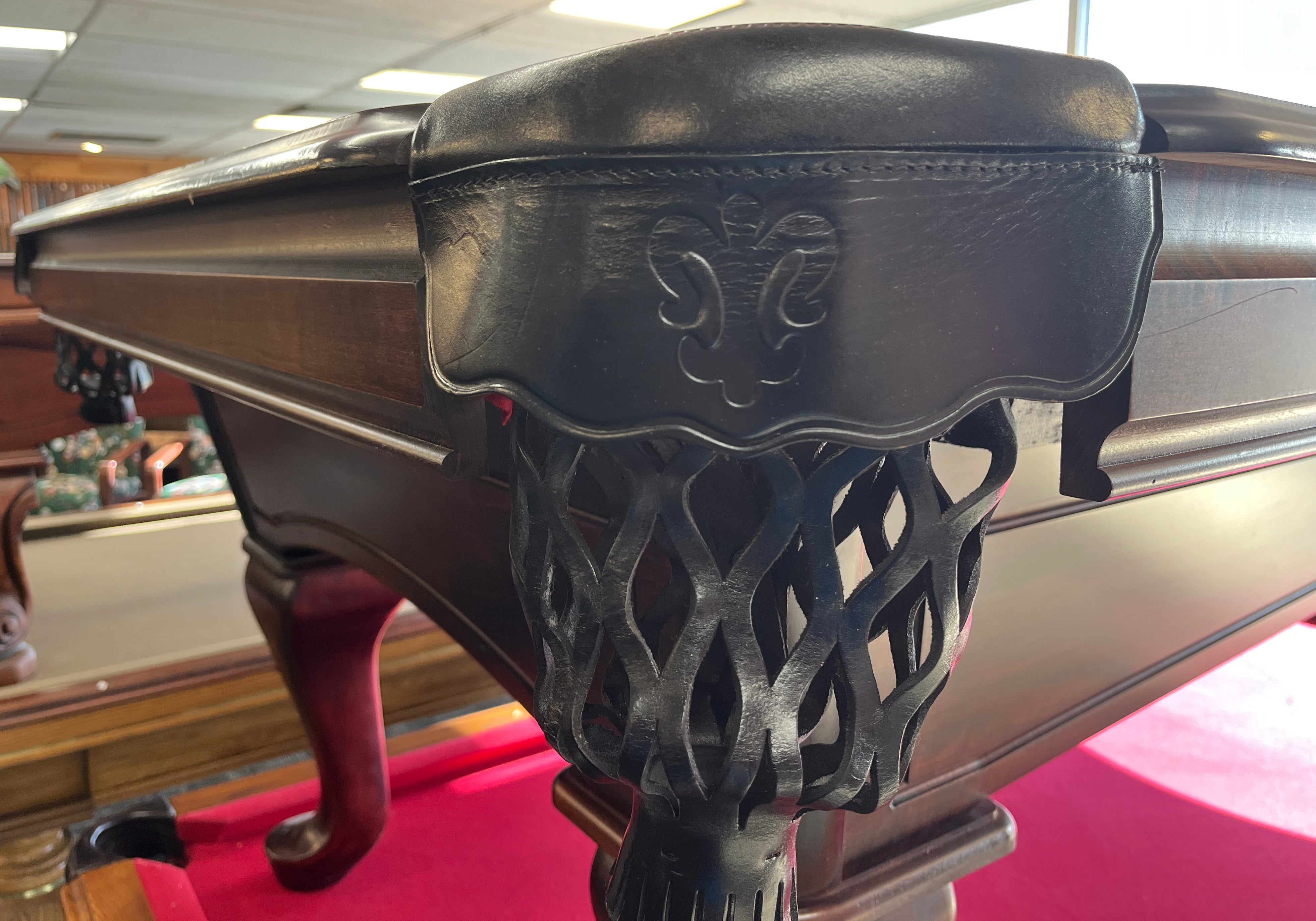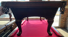 Beautiful Dark Cherry on Maple stain. This table has Quen Anne legs and all new black shield leather drop pockets. As always, our price includes your choice of felt colors from our ProLine Classic color palette, a play package with everything you need to start playing, and delivery and installation within a 30 mile radius of Loganville, GA. If you are not within our local service area, please call for any additional delivery fees.
