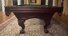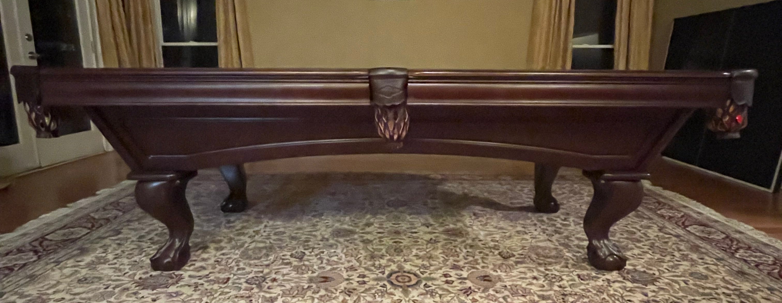Fantastic condition. Espresso stain with a matching 6-cue wall rack. Includes a fitted leather cover as part of the full play package. As always, our price includes your choice of felt colors from our ProLine Classic color palette, a play package with everything you need to start playing, and delivery and installation within a 30 mile radius of Loganville, GA. If you are not within our local service area, please call for any additional delivery fees.