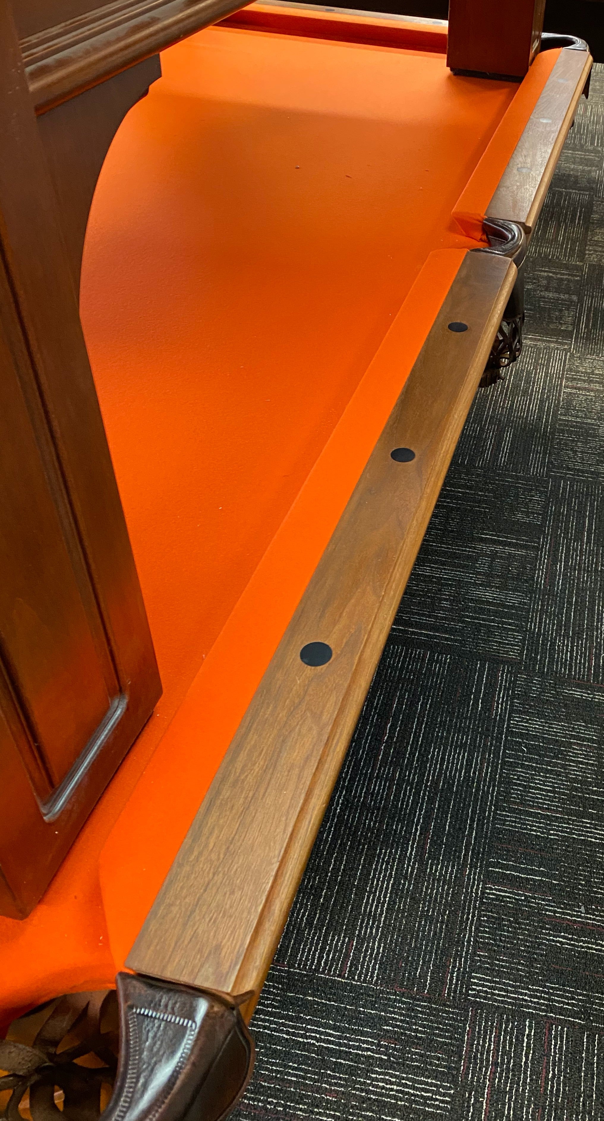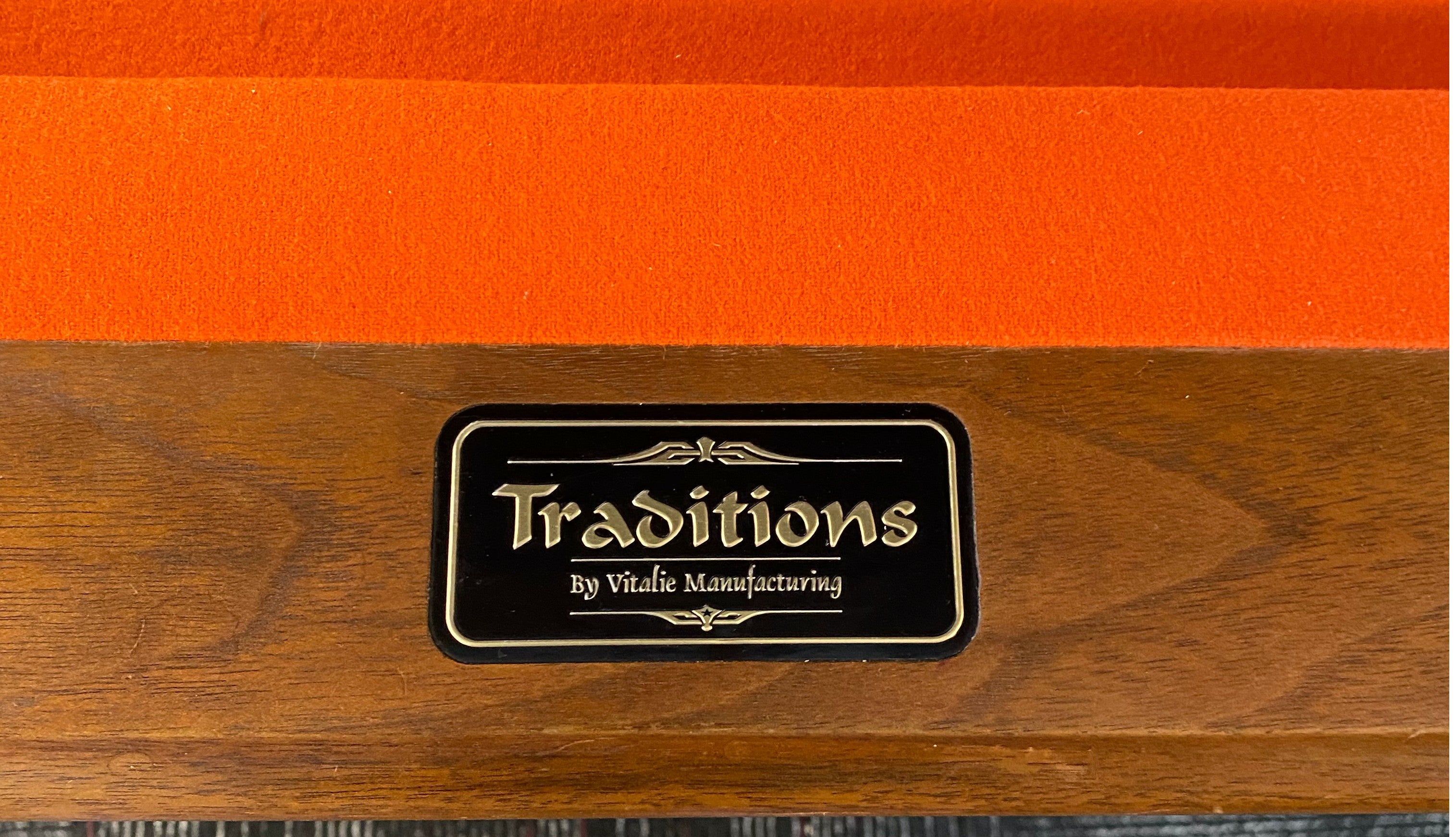 This collectible, highly-desired model features Vitalie's signature black walnut rails on a frame and legs of multi-hue select woods with honey finish. The large black accent sights are very rare and were offered almost exclusively by this obscure manufacturer from Rosman, N.C. This table is bound to be the focal point of your gameroom and a family treasure for decades.