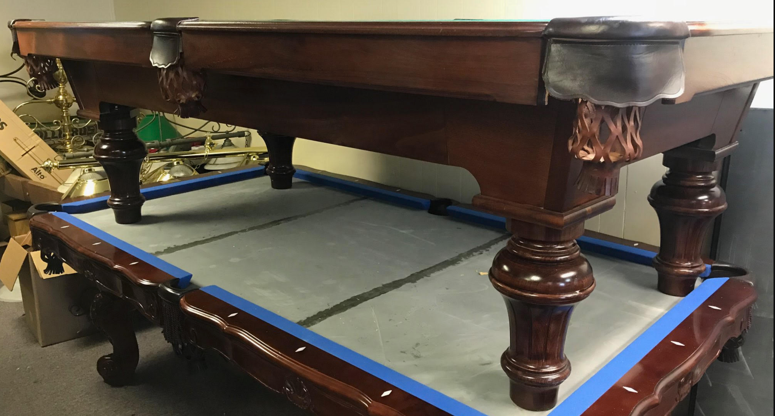 Solid Mahogany, gorgeous stain, fluted legs. As always, our price includes your choice of felt colors from our ProLine Classic color palette, a play package with everything you need to start playing, and delivery and installation within a 30-mile radius of Loganville, GA. If you are not within our local service area, please call for any additional delivery fees.