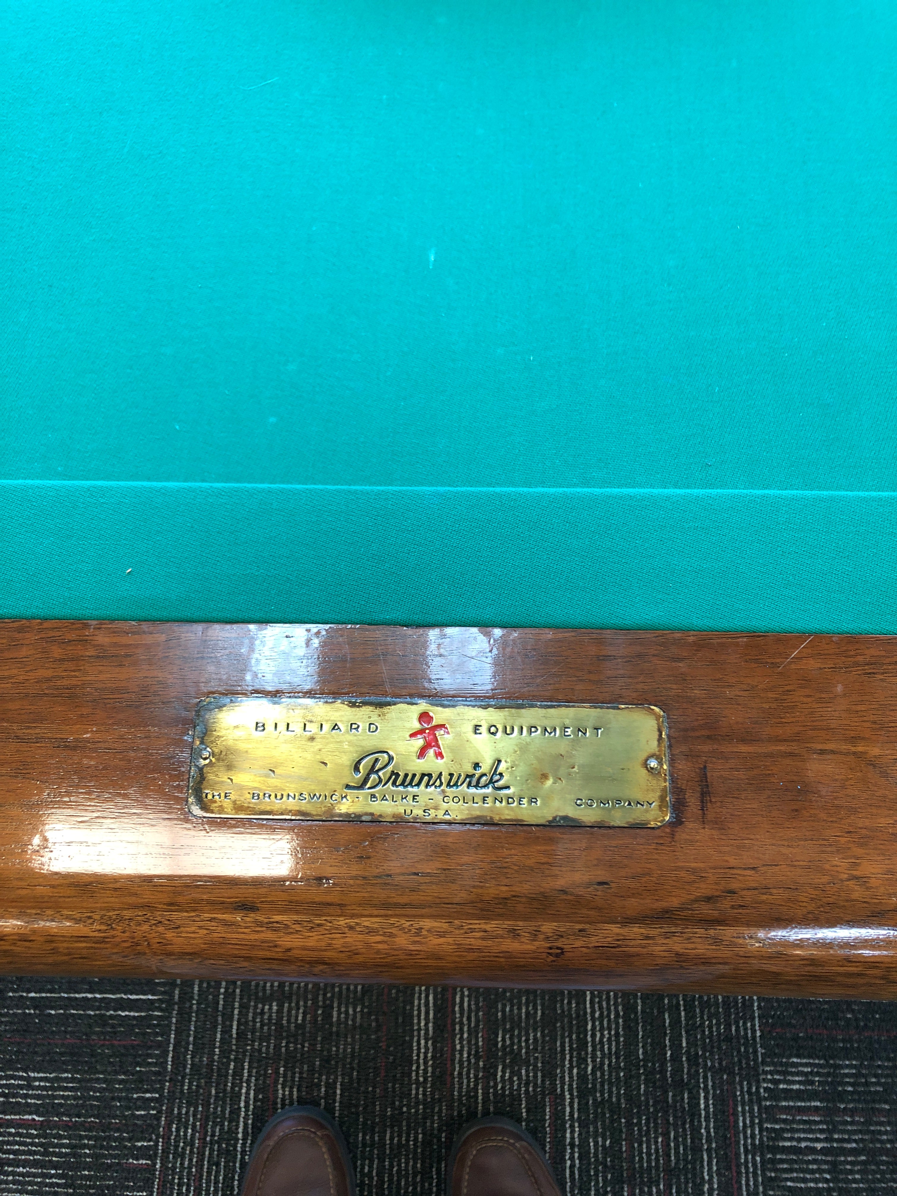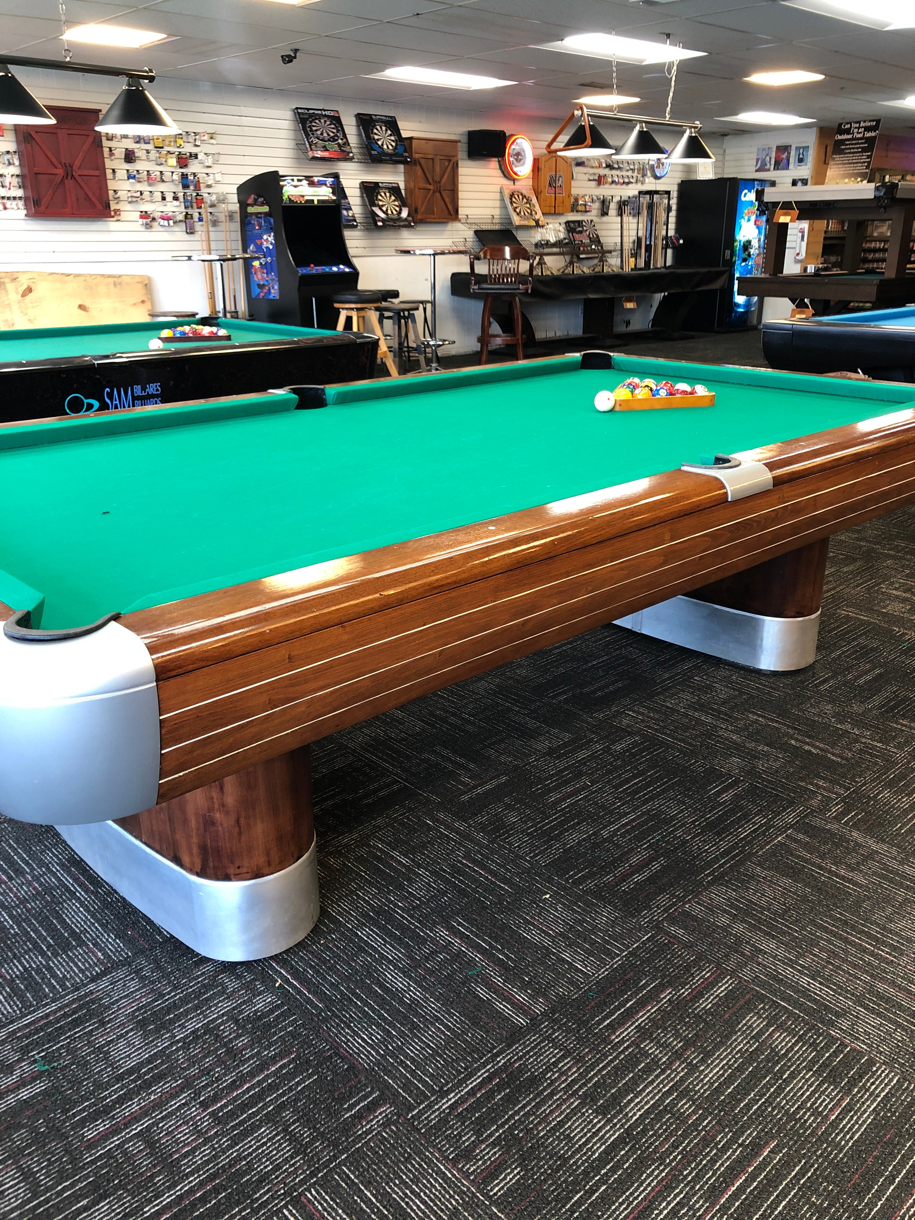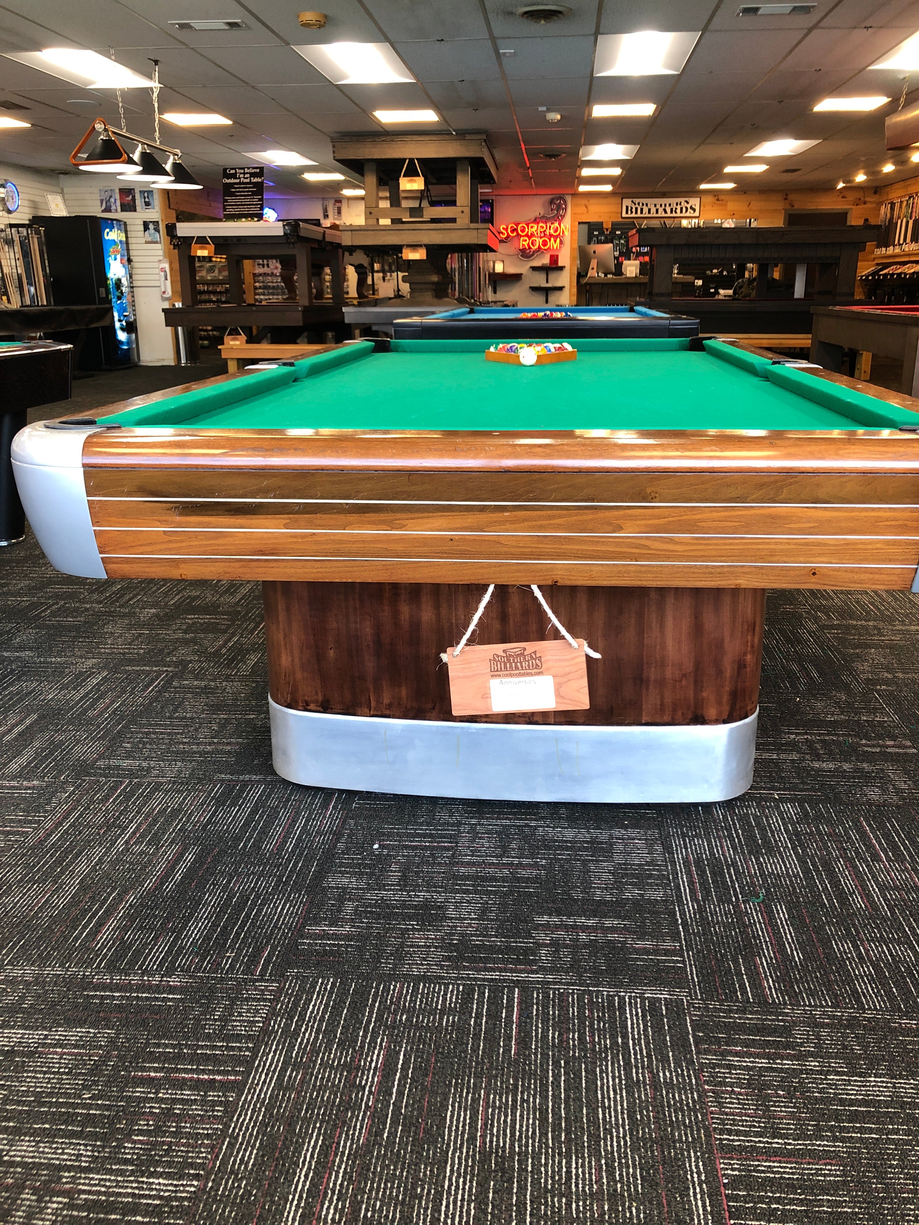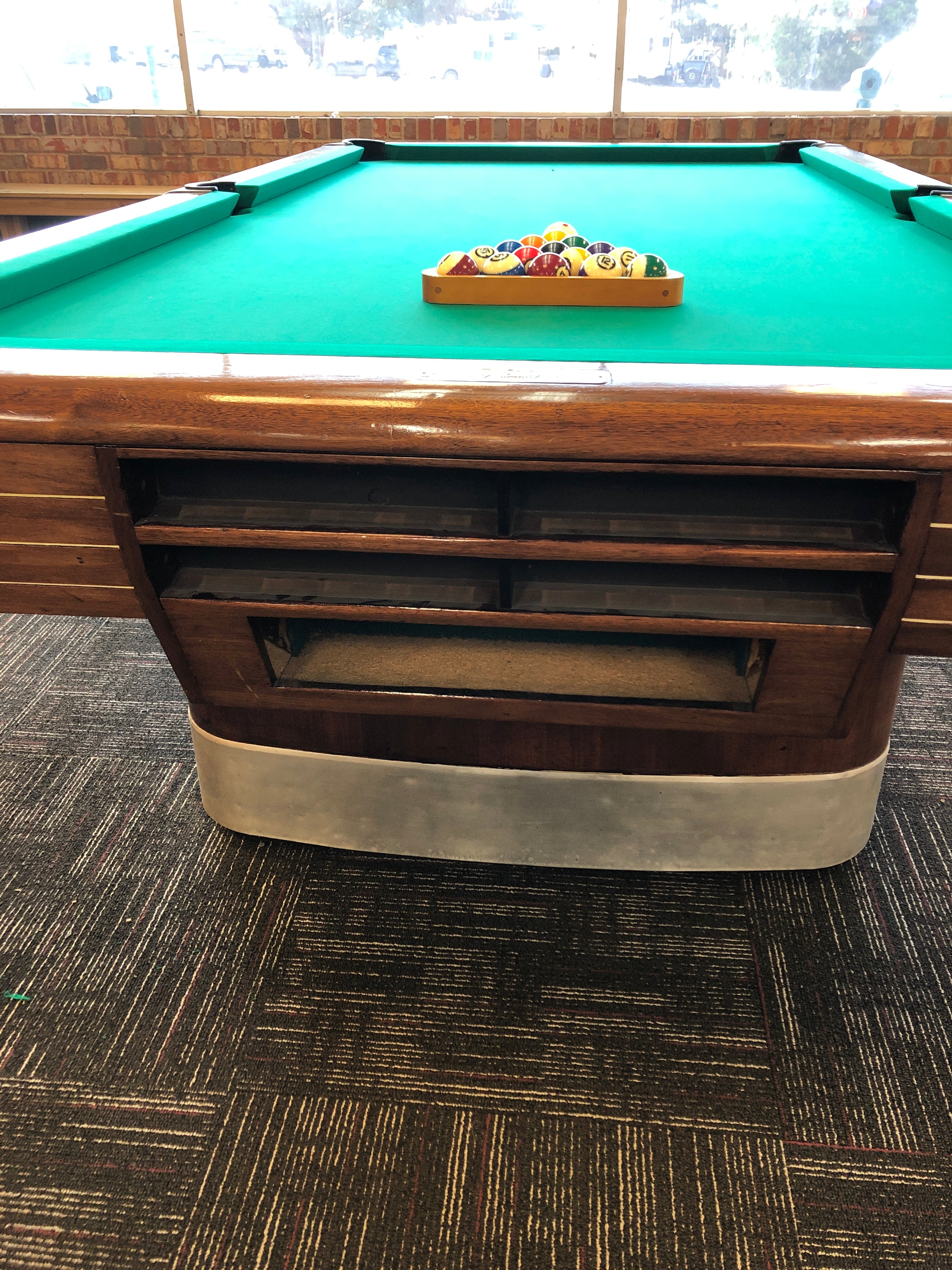The Annniversay by Brunswick. This beautiful example originally came with a ball return system. It can be assembled with ball return or, if you choose, with drop pockets. Excellent condition on this older Art Deco style pool table. Price includes your choice of felt colors from the Proline classic palette. Add $100 to choose Simonis 860 cloth. As always, our price includes a play package with everything you need to start playing, and delivery and installation within a 30-mile radius of Loganville, GA. If you are not within our local service area, please call for any additional delivery fees.