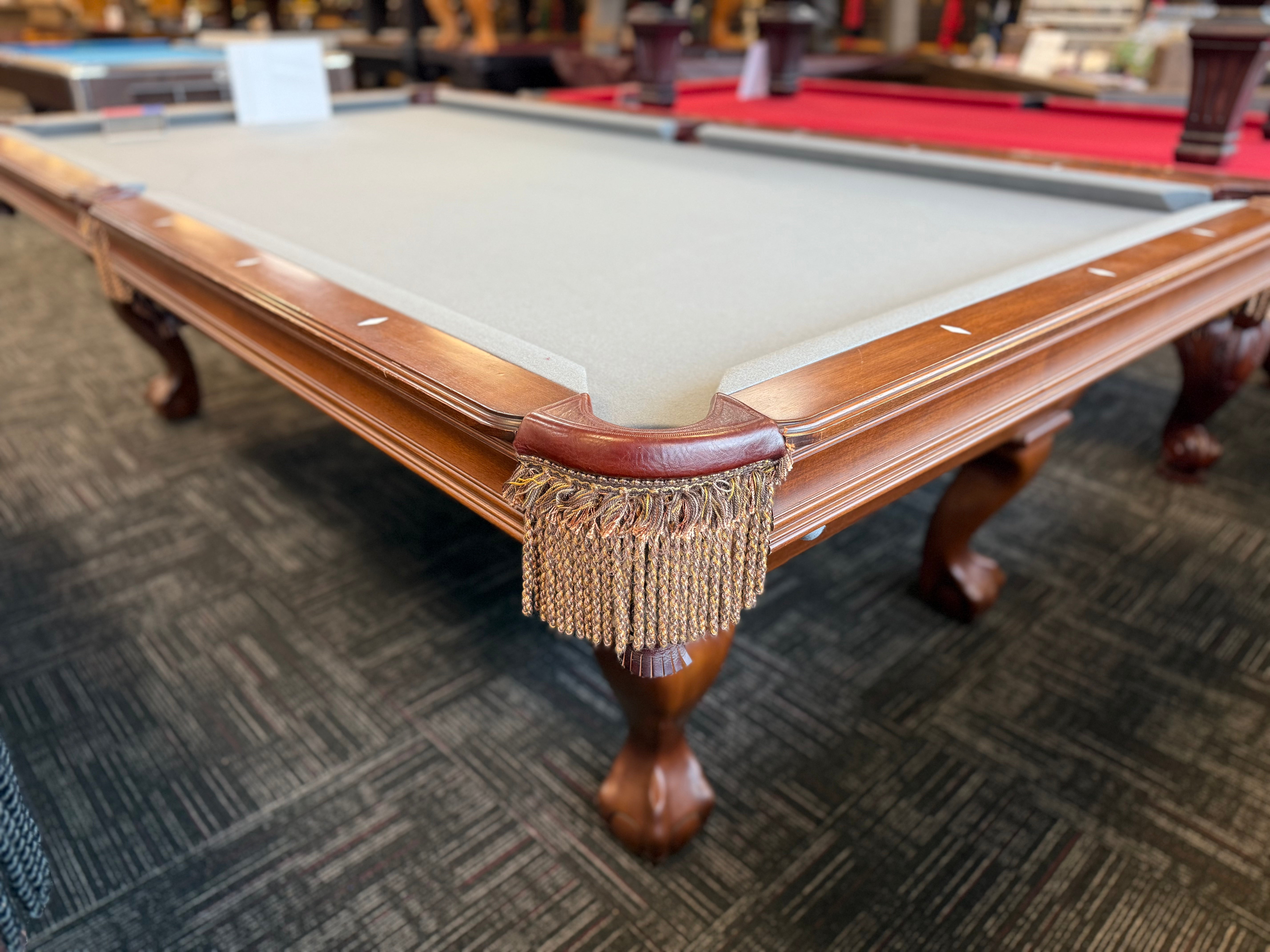 Bring timeless tradition and endless entertainment to your home with the 9' Brunswick Pool Table. Adorned with classic fringe-style pockets and a beautiful traditional mahogany finish, this table is a sophisticated centerpiece for family and friends to gather around and enjoy for hours. Don't miss out on the opportunity to enhance your home and elevate your game with this like new pool table.