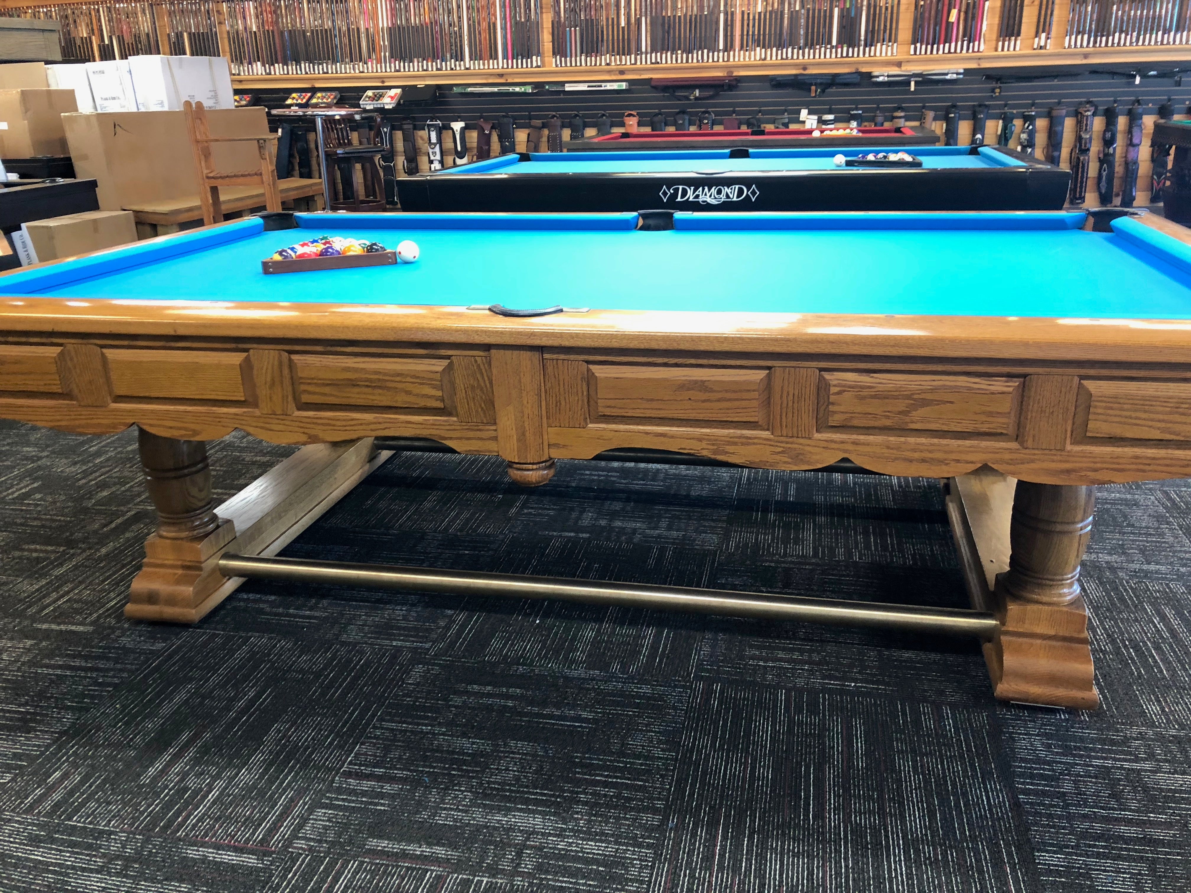The Oak Prestige by Brunswick. Excellent condition on this older solid oak pool table. Can be delivered with the existing brand new high speed Simonis 860 cloth or select your choice of felt colors from the Proline classic palette. As always, our price includes a play package with everything you need to start playing, and delivery and installation within a 30-mile radius of Loganville, GA. If you are not within our local service area, please call for any additional delivery fees.