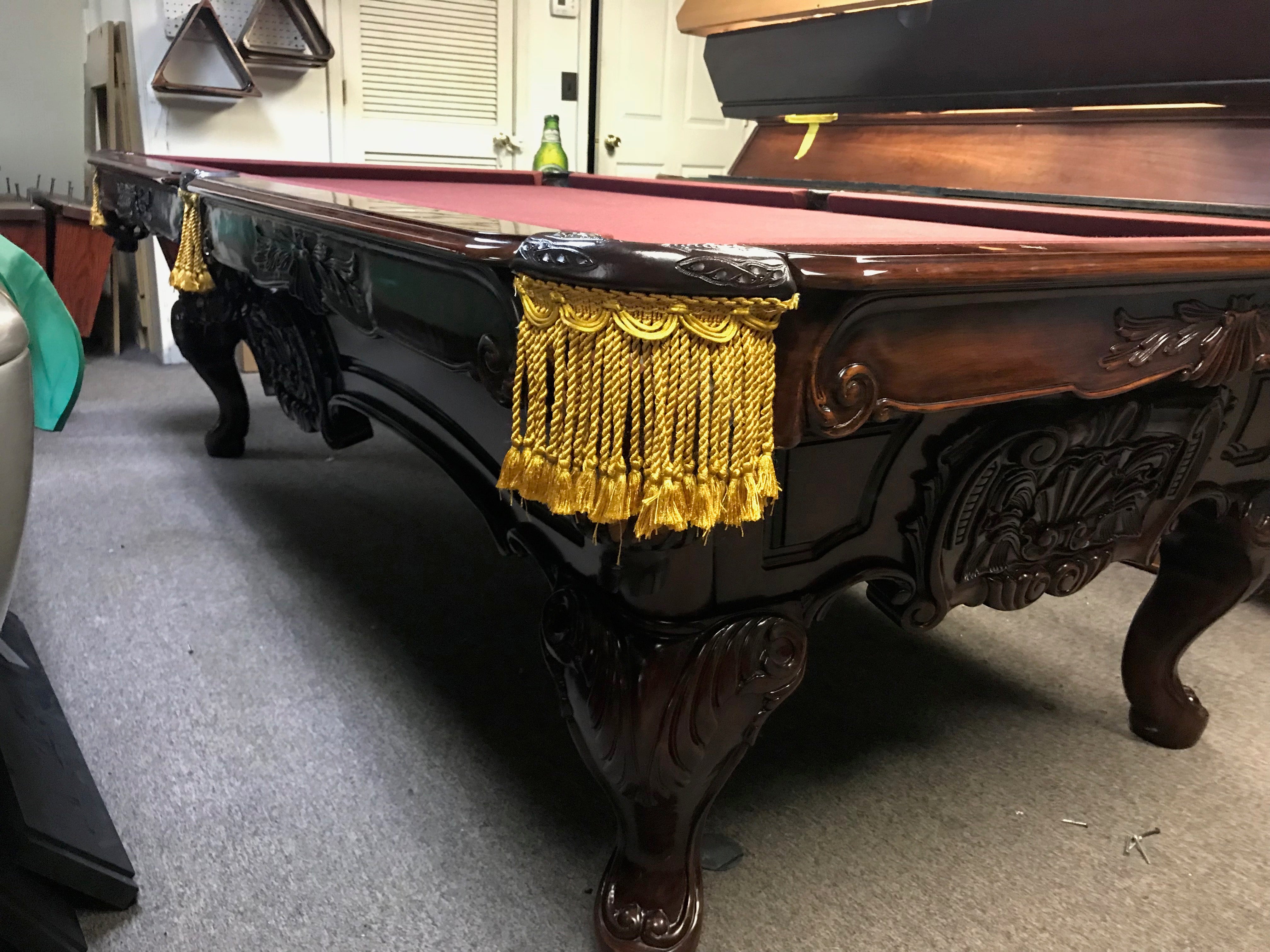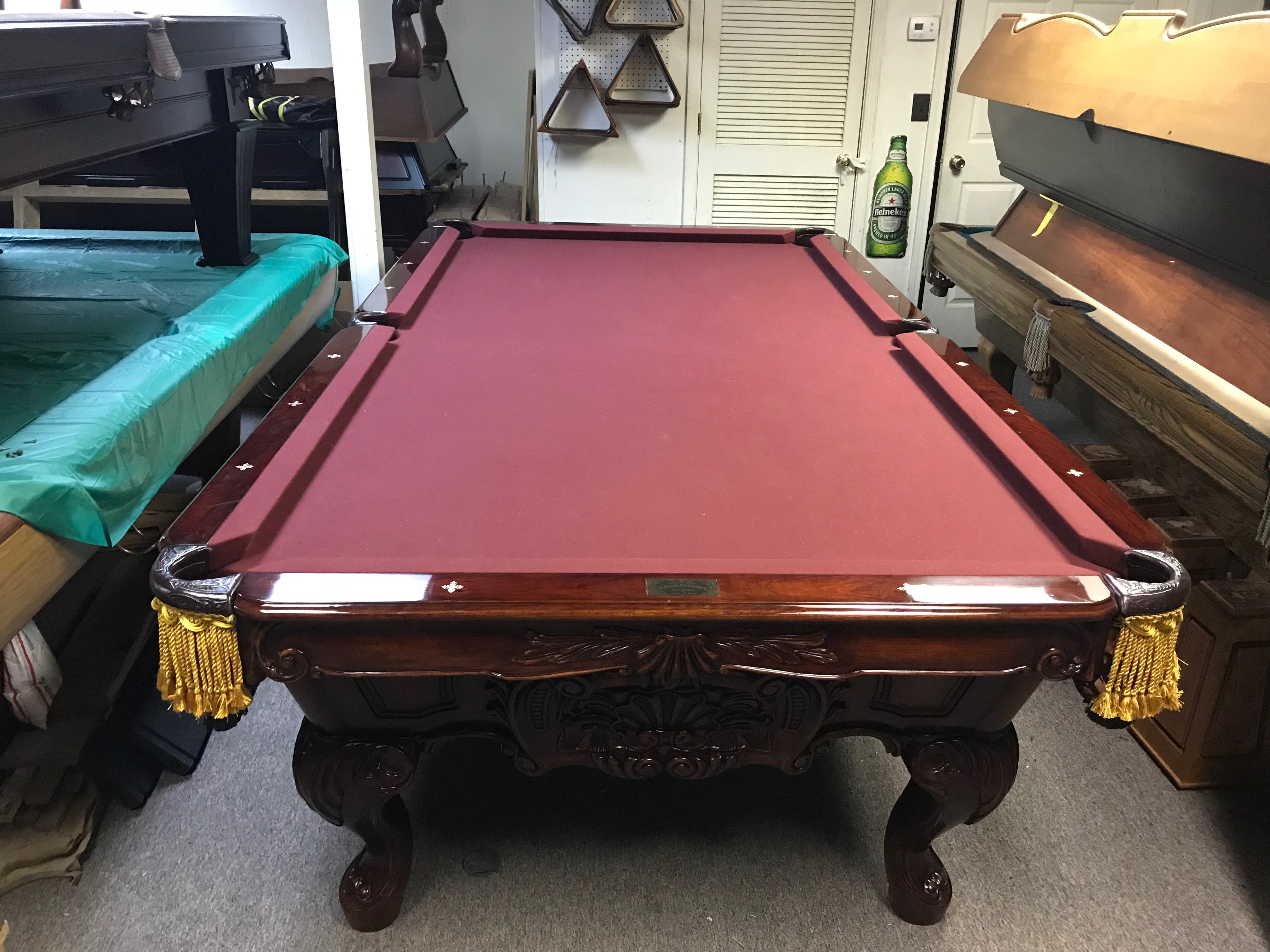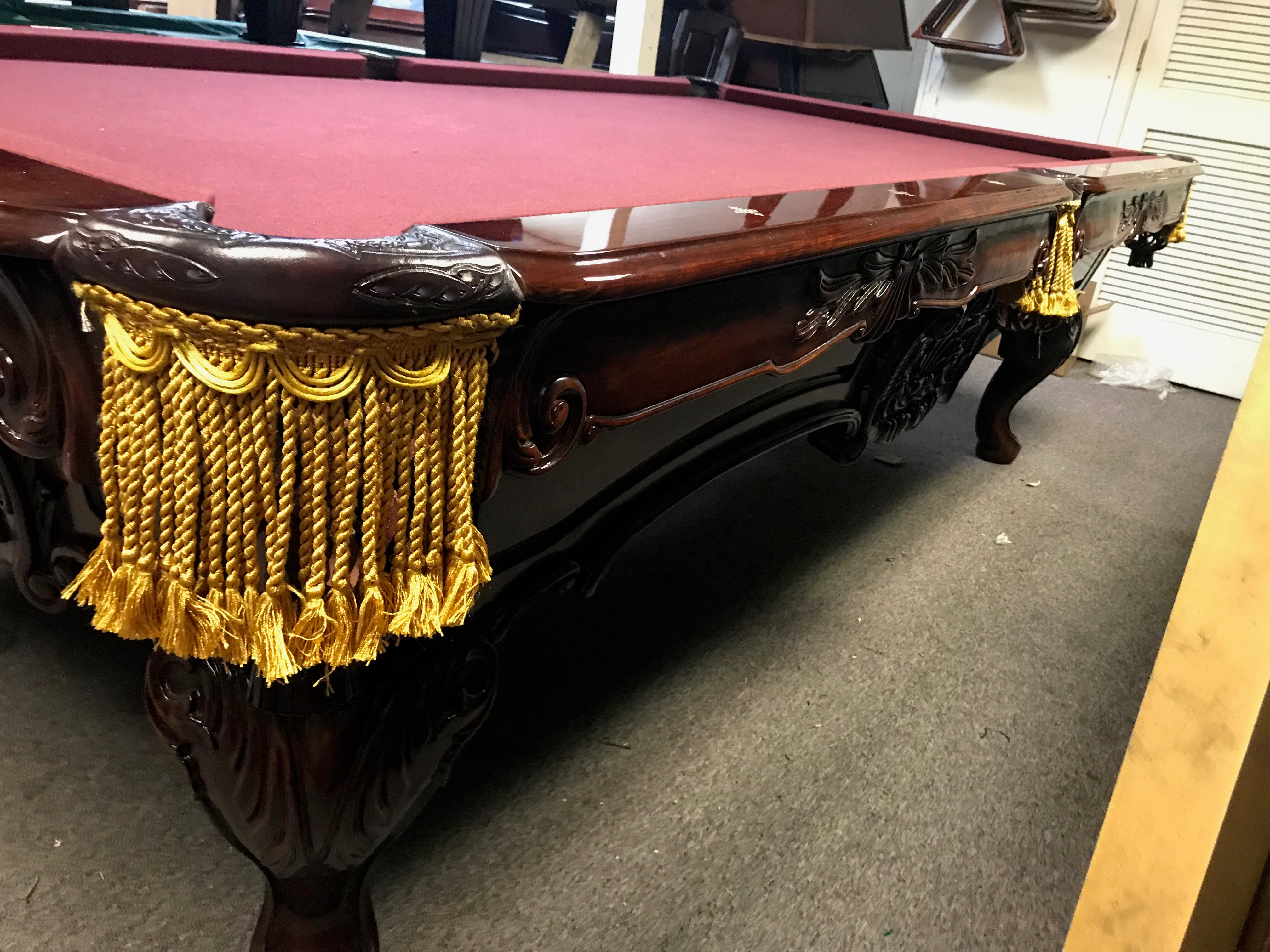 Gorgeous stain, elaborately carved, with gold fringe pockets. This table cost well over $10,000 when it was new. We are offering this table with your choice of felt color, lifetime warranty cushions, used equipment play package and free delivery and installation within a 30-mile radius of Loganville GA. Outside this area, call me for additional pricing.