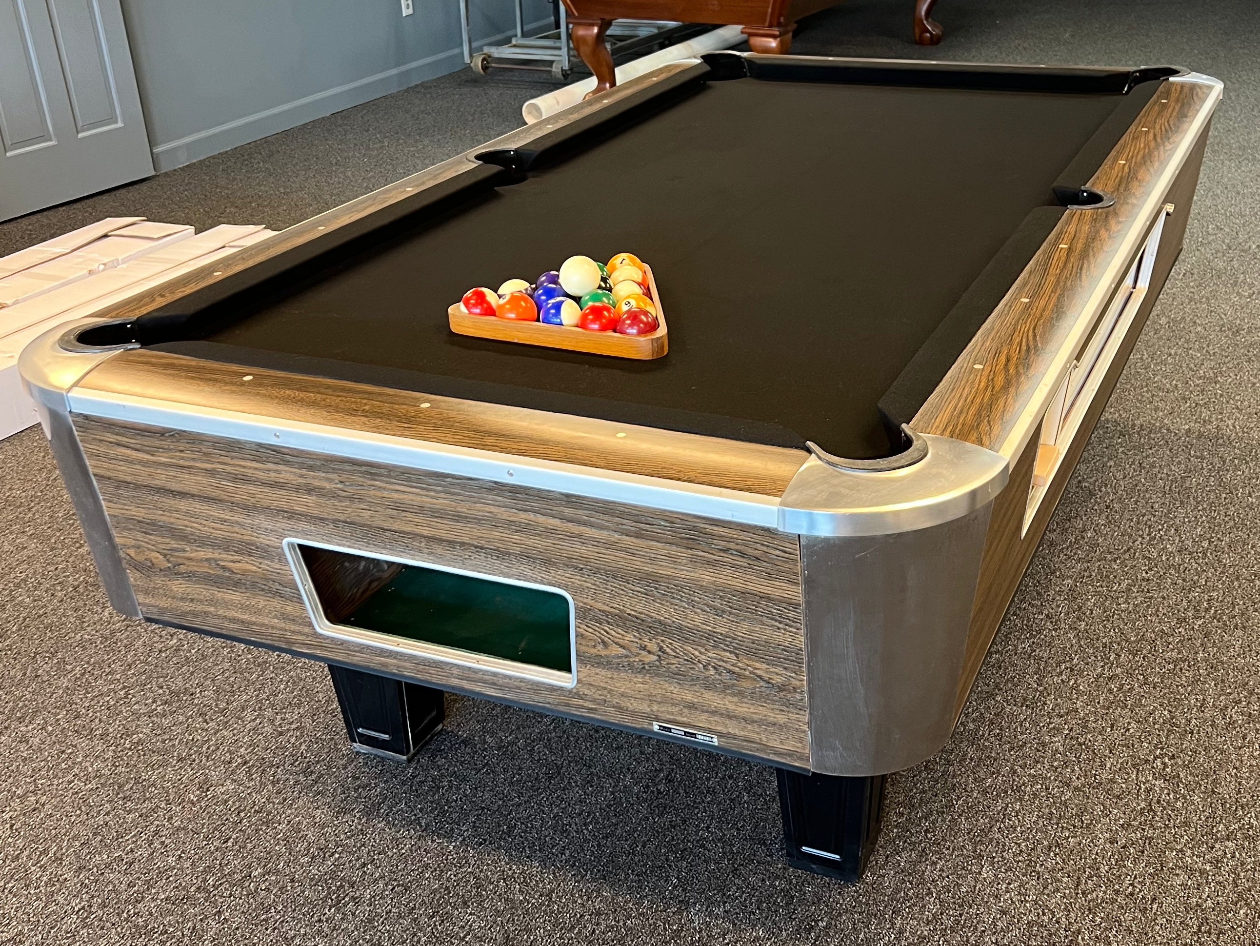 This beautiful original bar table has been completely refurbished with new cushions and new black cloth. Set on free play so no coins necessary! Comes with a used play package (balls, cues, triangle, table brush, and black chalk) and includes delivery into your garage, not a loft or basement. Call me to discuss if you have somewhere other than a garage for delivery. Delivery and installation included within a 30-mile radius of Loganville, GA.