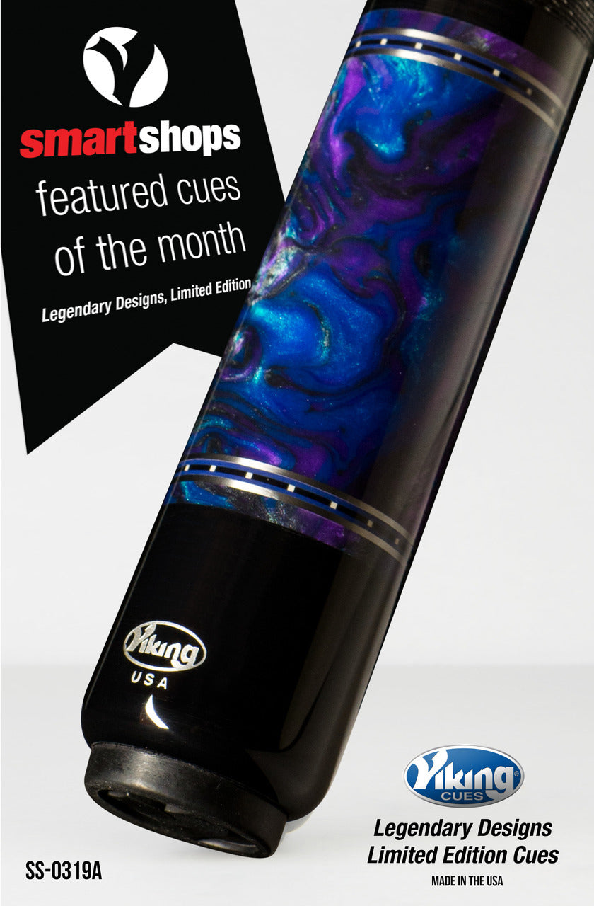 The Viking Smart Shops cue of the month for March 2019, the SS-0319A. This cue comes standard with a Tiger Everest tip and ViKORE American performance shaft. A beautiful cue featuring 32 Blue Dream and White Premium Pearl and Black IMA Inlays.