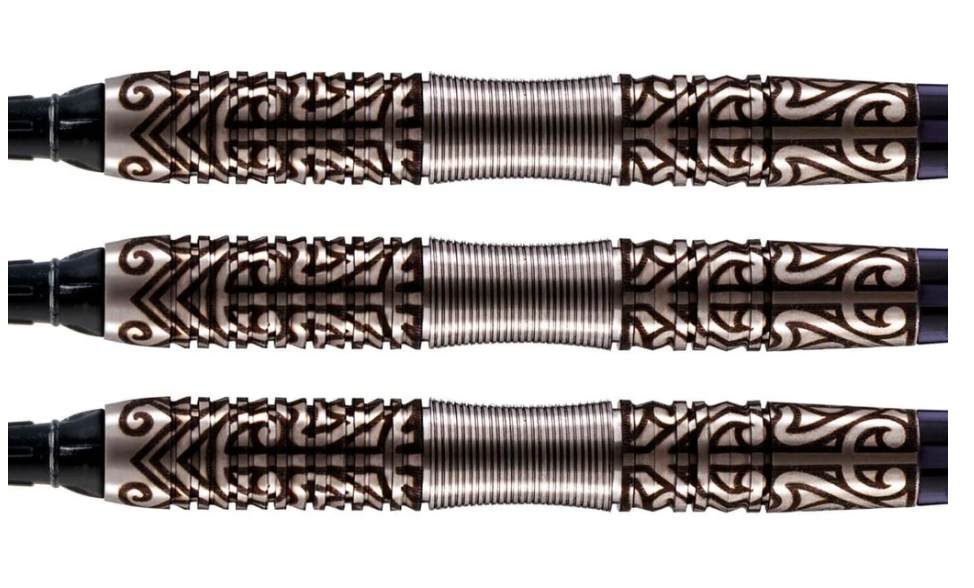 Fate rewards the fearless. If bravery is half the battle, Hautoa – courageous and daring in Te Reo Māori – is your other half. Inspired by its elder brother, Shot Darts Warrior 3, this center weighted, 80% tungsten barrel has a slim nose with a front shark fin grip. It’s followed by a scalloped band, precision placed to give you perfect center grip placement and pure confidence. Warrior Hautoa is adorned with cinder grip in a contemporary tribal tattoo design, which adds superfine traction and control in distinctive Shot Darts style. The source of your strength is also a challenge to play at your best. Set of three. Made in New Zealand.