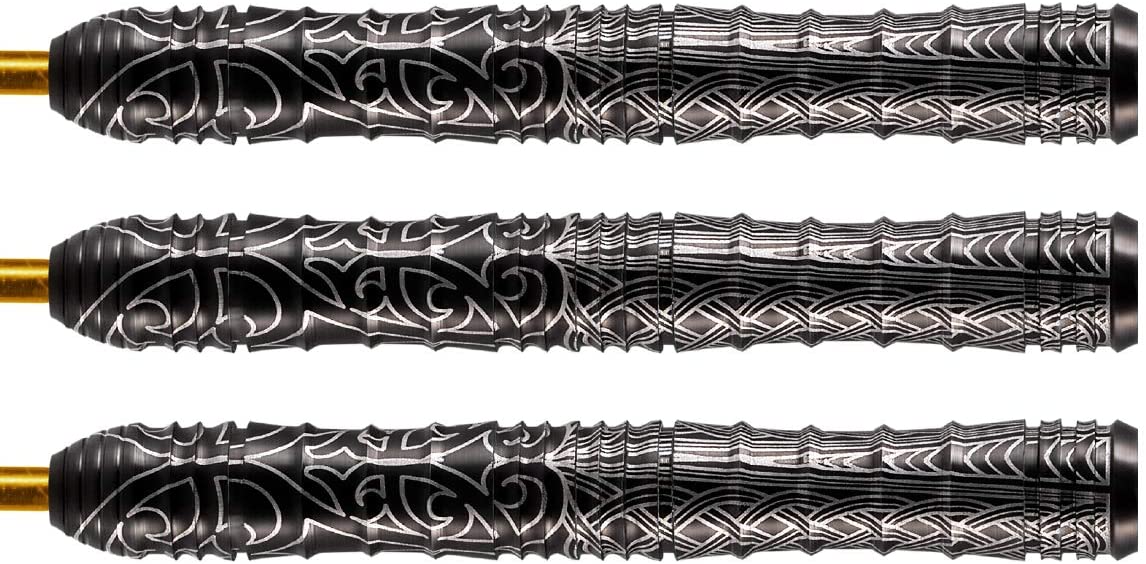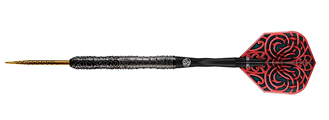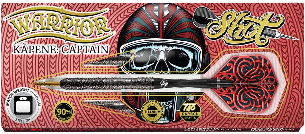 The Ultimate Warrior - To celebrate 50 years of dedication to making darts, we wanted to create something special for our global tribe of players. The Warrior Kapene showcases where Shot has come from and embodies the spirit of where we’re going – a nod to our past and future. Kapene translates as Captain – a tribal leader to guide us into the next 50 years. This dart is inspired by our home, and honours the warrior within. We commissioned Tauranga carver Whare Thompson to design a sleeve ‘Ta Moko’ tattoo that wraps around and runs along the length of the barrel and is echoed in the flight. Forged through fierce competition and battle-hardened technique, honed since 1970, Warrior Kapene steps forward to steer our global tribe into the next 50 years. With a straight shape and center weight, Kapene boasts a generous shark grip along the barrel. Rear and front scallops give this 90% Tungsten dart set two positive throw areas – for a strong push and a sure reference point. Armoured in superfine Titanium with a laser-etched Ta Moko (tribal tattoo) sleeve that’s echoed in its flight. The Kapene is a very agile dart, with grip featuring along the entire barrel, dart players can find positive finger placement at any point. A slight front scallop follows the smooth ring grip nose; then flows on to a telescopic-like wide shark grip. A more extensive scallop features at the rear of the dart. The decorative Cinder Grip has been laser applied and adds a layer of superfine traction which aids a controlled throw. Made in New Zealand. Set of 3.
