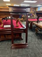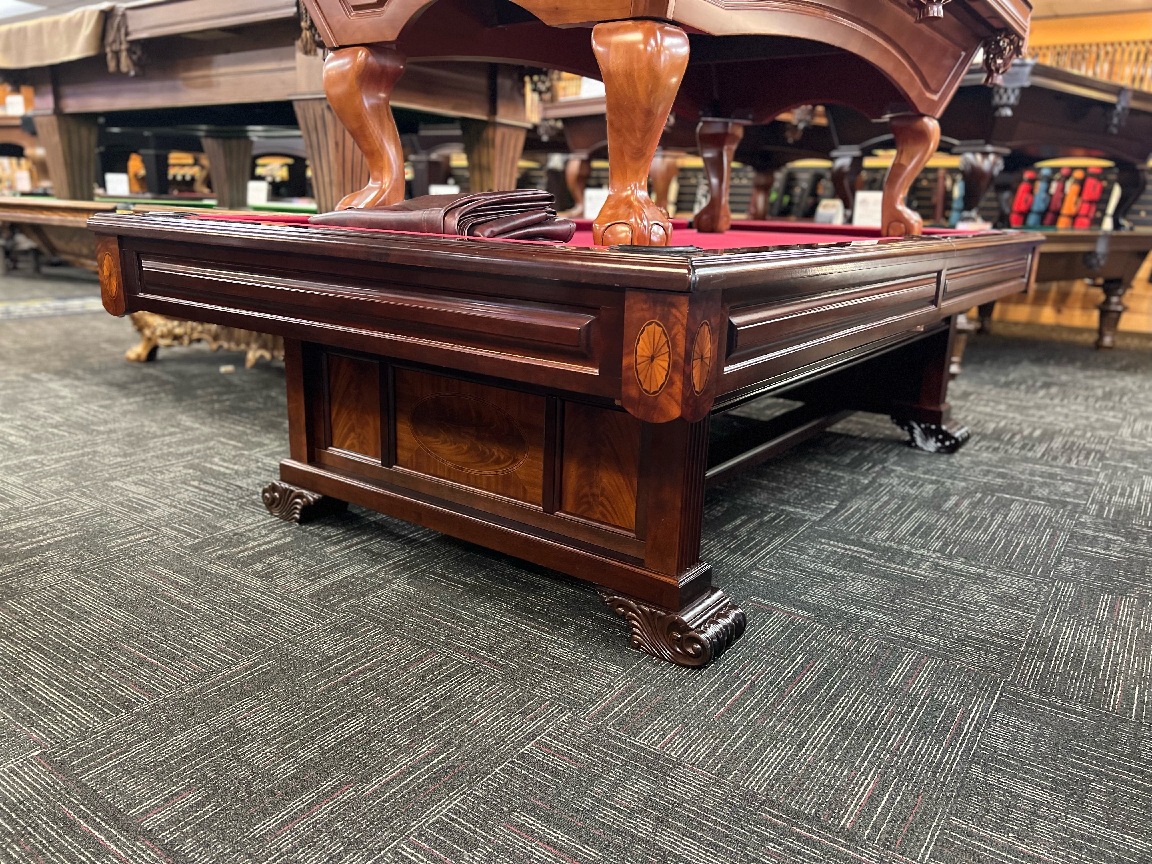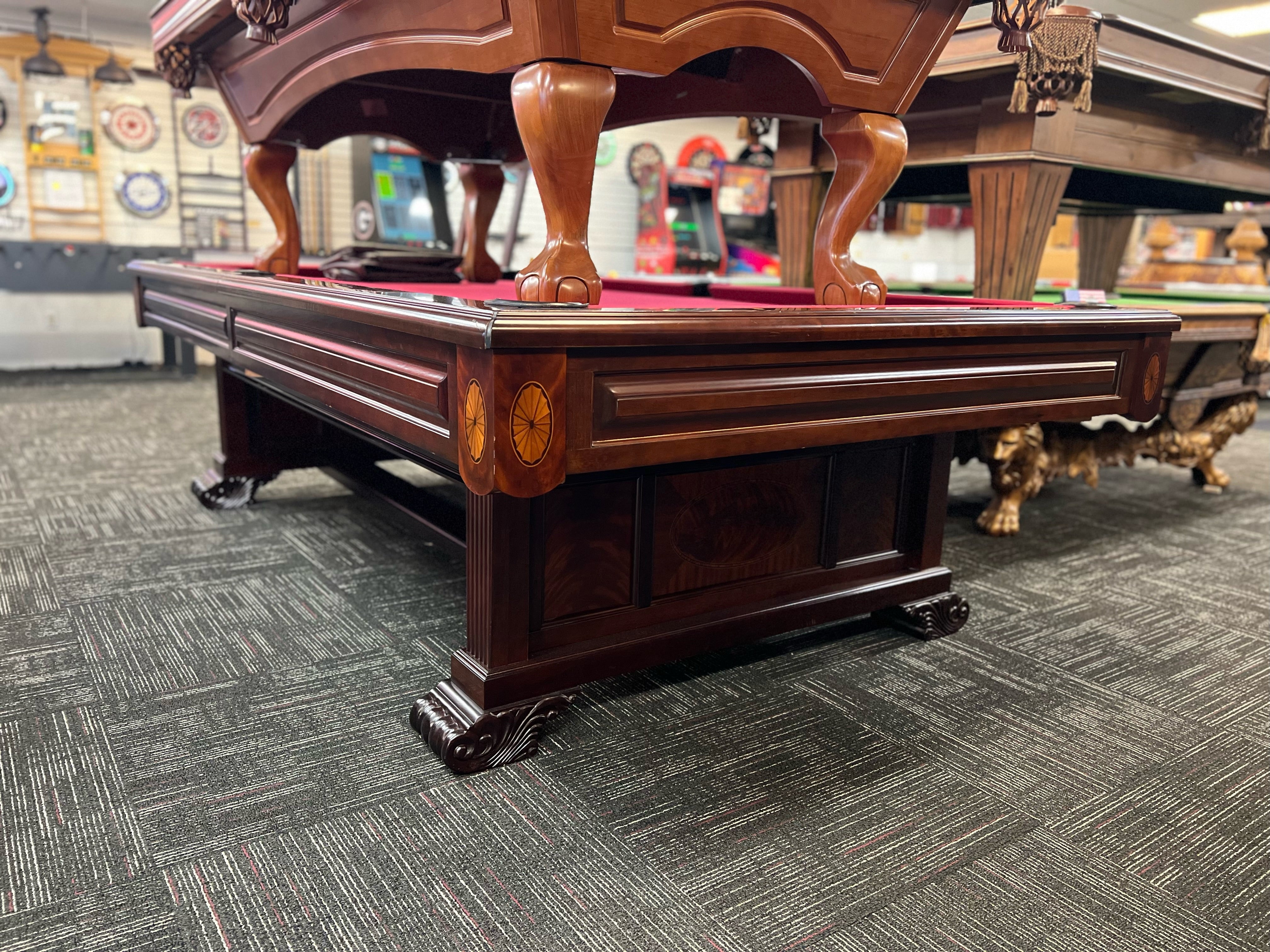 This table is the epitome of quality and craftsmanship. Expertly crafted and built to exceptional standards, this table brings unparalleled quality to your game room. Made by Brunswick, a trusted name in the industry, it's a smart investment for any serious player. Adorned with simple yet elegant inlays, it perfectly displays the beauty of the wood behind a stunning mahogany finish. With leather drop pockets, mother of pearl sights, and the matching racks, this table is sure to bring you gameroom to the next level.
