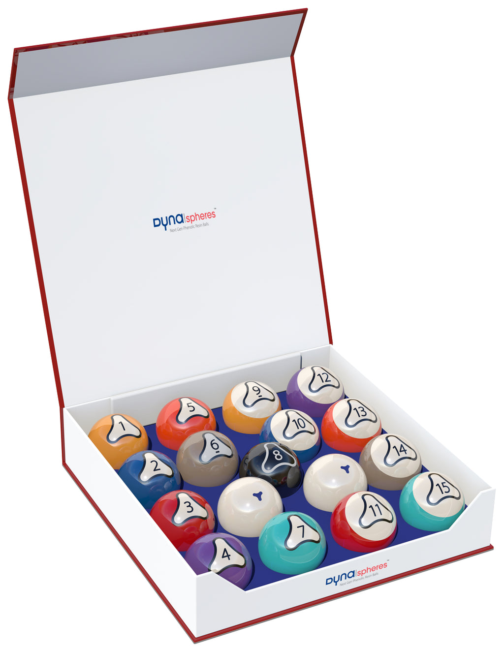 The Dynasphere Platinum 2-1/4 in. pool balls feature industry changing technology that is sure to impress. Belgian designed and distributed, each ball endures a rigorous production and testing process taking 23 days and 49 individual steps to complete. Each set includes two cue balls that feature six blue rotors for increased feedback on spin. The rotor design is integrated into every solid and striped ball. Also included are Dynasphere 8-ball and 9-ball racks.