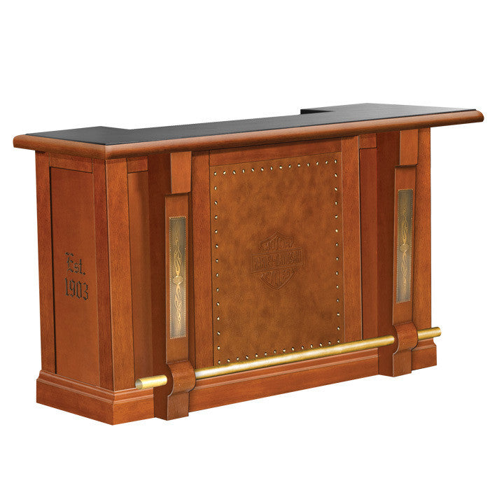The H-D¨ Bar & Shield Flames Bar is the perfect addition to your entertainment area! This beautiful bar is made with North American Hardwoods and hardwood veneers and is highlighted by a reconstituted leather panel that is accented by hand set studs and the Bar & Shield embossed logo. The side panels of the bar are laser engraved with "Est. 1903" and the front columns feature hand finished Bar & Shield flames metal plates. The surface is also made with reconstituted leather and includes cutting board, stainless steel dry sinks, and stemware rack. Space is a big part of food and drink service and with dual display shelves, drawer and cabinet you will find that this Harley-DavidsonH¨ Bar provides plenty of space! Comes fully assembled. (also available in Vintage Black see:HDL-13000-V)
