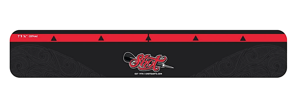 The Shot! Darts throwline is made from durable hard wearing material to prevent early wear. Self adhesive backing sticks to all hard surfaces to provide a throwing distance line with precise toe line-up points for exact foot placement.