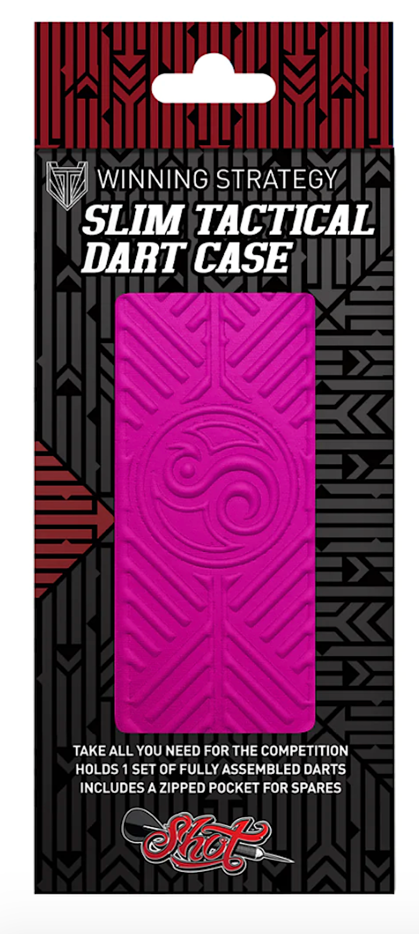 At 18 x 8cm the Shot Tactical Dart Case carries 3 fully assembled darts without crushing dart flights. Firm foam slots hold and protect the 3 fully assembled steel tip or soft tip darts. But that's just the start. A quality zip closure opens the case like a clamshell. This quality dart wallet is great for tournaments or darts sessions with your friends. Its opposite side has a deep zipped pocket that fits even a plus-sized phone, plus keys and wallet – keeping hands and pockets free as a bird. Useful for spare gear: dart shafts, dart stems, dart flights, spare dart points. Whatever you need for the man cave or darts night. The Tactical slim darts carry case is pink, black, blue, or red with Shot's tribal design and other printed design themes like Warrior or Viking. This case will last but it's packaging won't. Place it in your recycle bin – and play on.