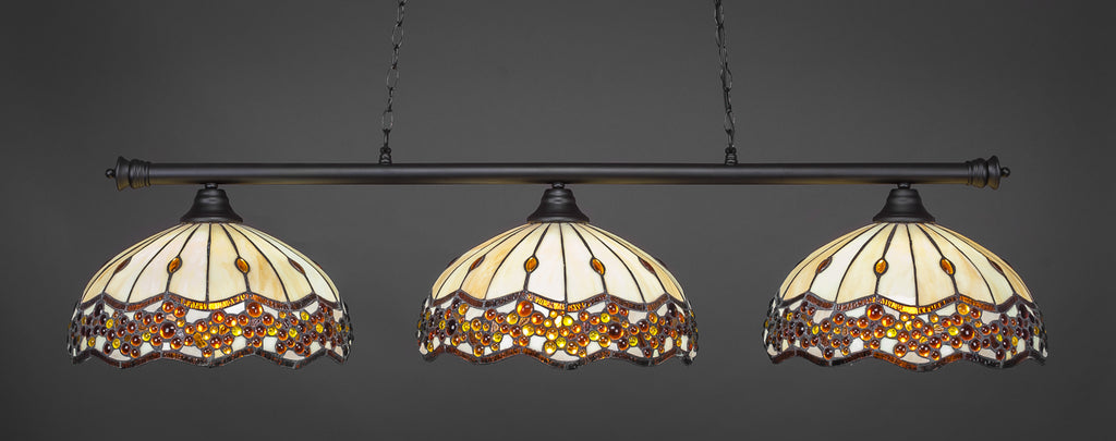 The 373-MB-997 light from Toltec is part of their Oxford series and is an excellent non-traditional choice for contemporary billiards table or island lighting. It is rated at 120V for indoor use and is designed for hardwired installation. The 373-MB-997 requires 3 Incandescent bulbs. Includes manufacturer 1-year warranty. Some assembly required (instructions included).