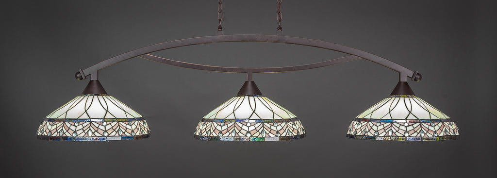 The 873-DG-948 light from Toltec is part of their Bow series and is an excellent non-traditional choice for contemporary billiard table or island lighting. It is rated at 120V for indoor use and is designed for hardwired installation. The 873-DG-948 requires 3 Incandescent bulbs. Includes manufacturer 1-year warranty. Some assembly required (instructions included).