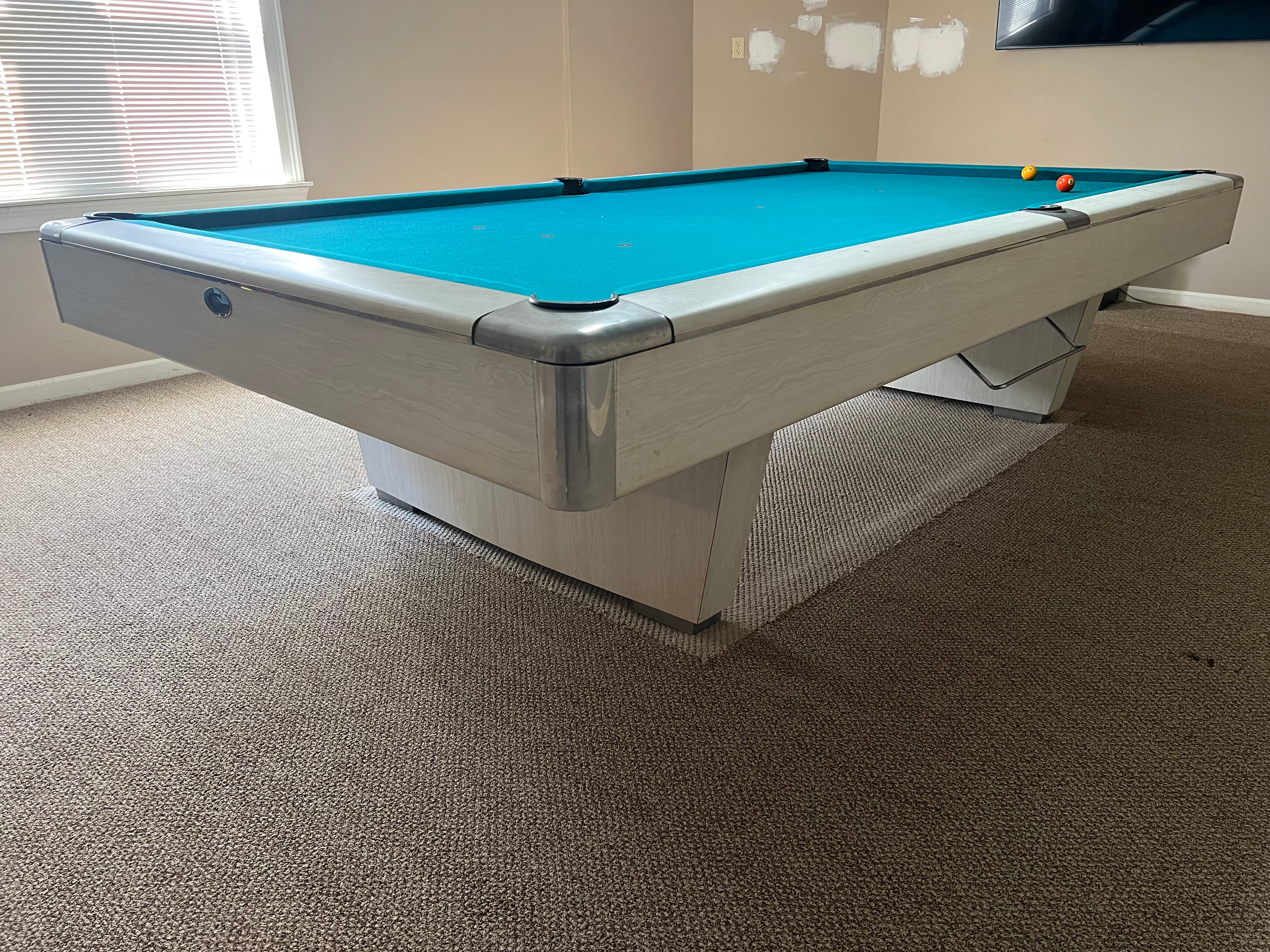 This table is in fantastic condition and comes with new Spruce Simonis cloth (Not Shown), a used play package including a snooker set of balls AND a set of smaller pool balls that can be used on the snooker table. This table will be equipped with new Lifetime Guaranteed cushions and bends. Includes delivery and installation within a 30 mile radius of Loganville, GA. If you are not within our local service area, please call for any additional delivery fees. The fresh polish on the castings, new Simonis, and professional install is sure to make your gameroom one of a kind!