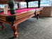 This tale has Flemish scroll legs, brown sheild drop pockets, straight frame, and routed rails. Please note that this is an "oversized 8" or "Pro 8" table. As always, our price includes your choice of felt colors from our ProLine Classic color palette, a play package with everything you need to start playing, and delivery and installation within a 30 mile radius of Loganville, GA. If you are not within our local service area, please call for any additional delivery fees.