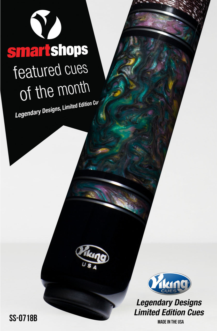 The Viking SS-0718B is a cue specially designed by Viking for July 2018. It features Galaxy Shimmer Premium Pearl inlays worked into a Boreaux maple finish that contrasts the colors perfectly. Limited production with a ViKORE American Performance Shaft and Viking Quick Release Joint. The Maroon/White Double Pressed 100% Irish Linen matches the finish and inlays for a truly custom look.